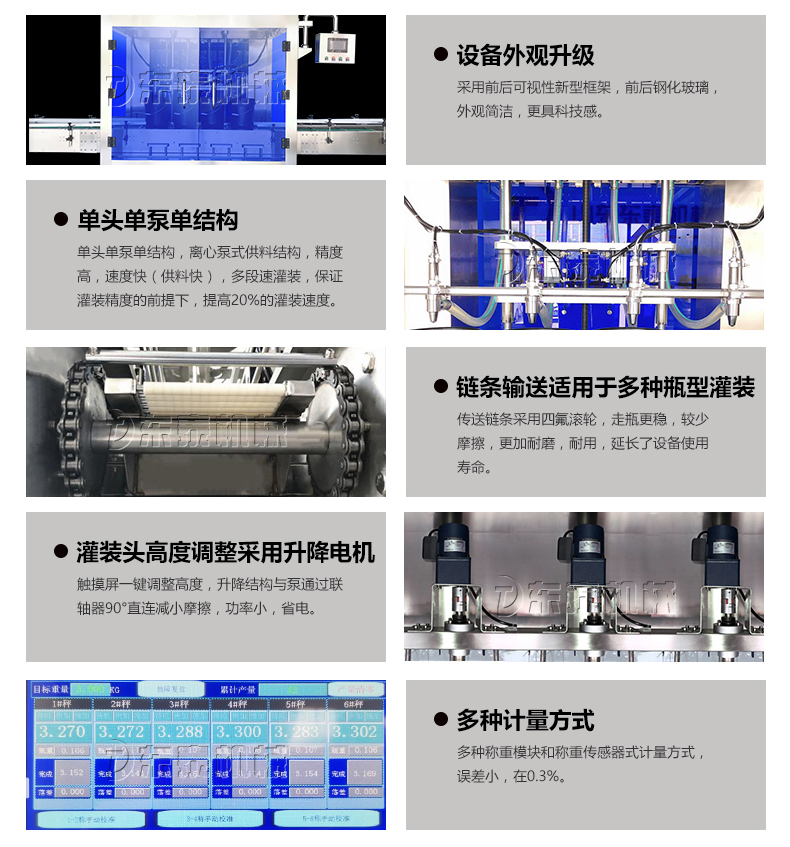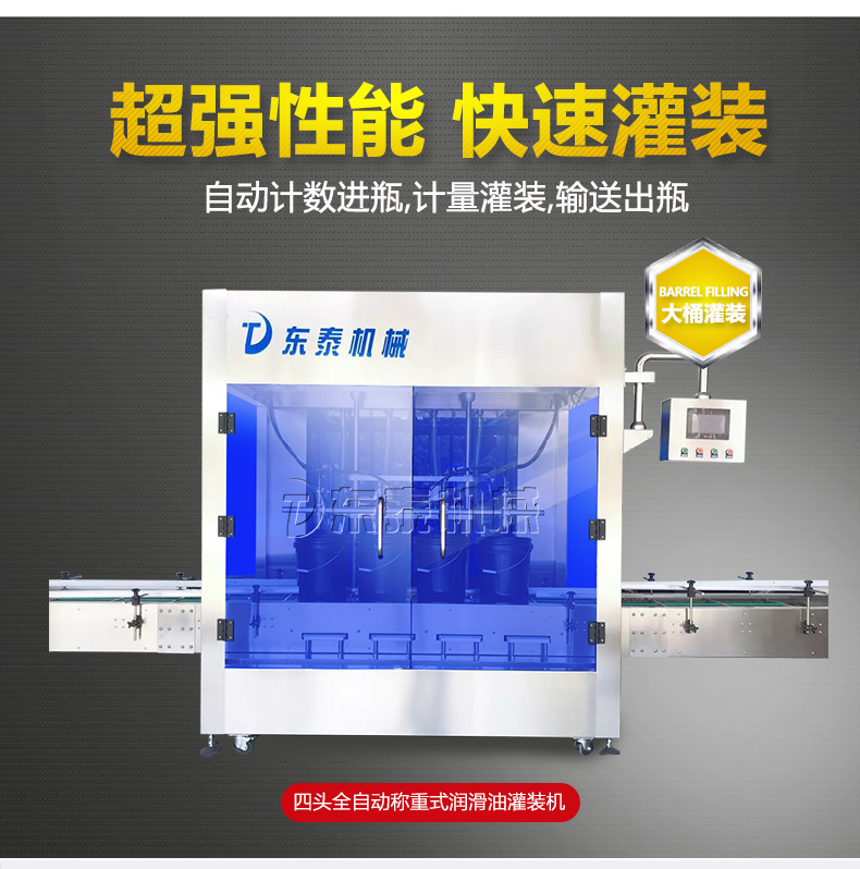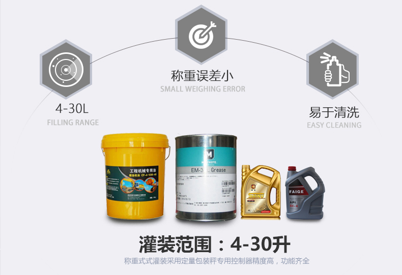 機油灌裝機適用于對4kg-25kg汽車用品類產(chǎn)品:潤滑油、防凍液、車用尿素等液體灌裝。自動完成計數(shù)進瓶、計重量灌裝、輸送出瓶等一系列操作。 特別適用于潤滑油、水劑、食用油的定量灌裝,是食品,醫(yī)藥,化妝品以及精細化工等行業(yè)的理想灌裝機。本機采用可編程控制器(PLC)、高速工控組態(tài)軟件進行實時監(jiān)控的控制,使用調(diào)節(jié)方便。整機按GMP標(biāo)準(zhǔn)要求制作,各管路連接采用快裝方式,拆卸清洗方便,與物料接觸部位及外露部位均采用不銹鋼制造。整機安全、環(huán)保、安全、美觀、能適應(yīng)各種不同環(huán)境工作。
